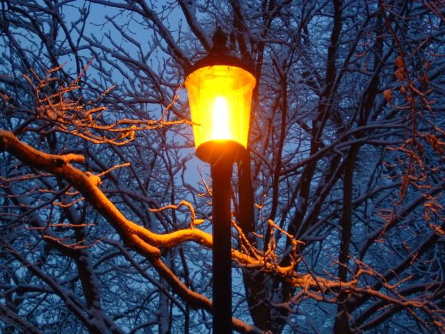 A street lamp in Royal Victoria Park illuminates a snow covered tree.