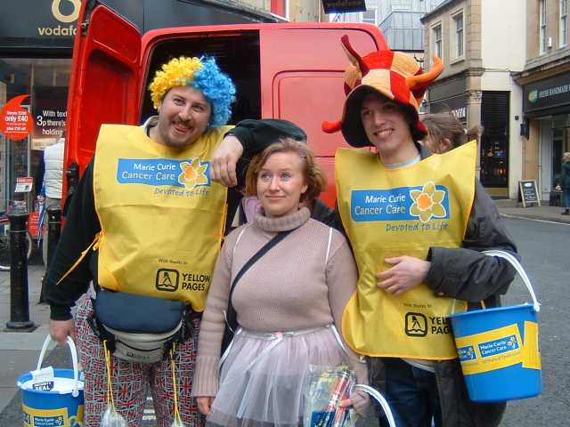 Panda, Helen and Jon at the end of the day, having been collecting for Marie Curie in Bath.