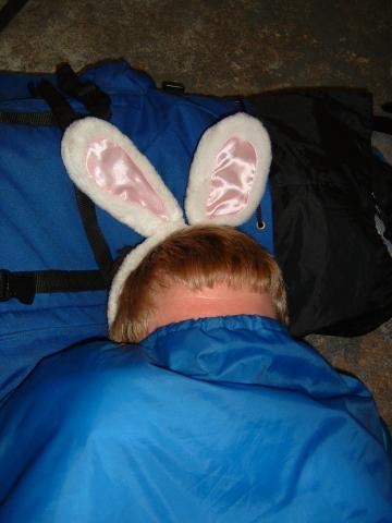 Paul hiding in his sleeping bag. The bunny ears are however a bit of a giveaway.