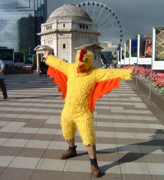 Huseyin dressed as a chicken enjoying the brief sunshine in Birmingham.