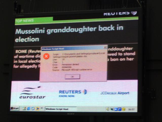 A VBScript error message on one of the big Reuters displays at London Victoria.