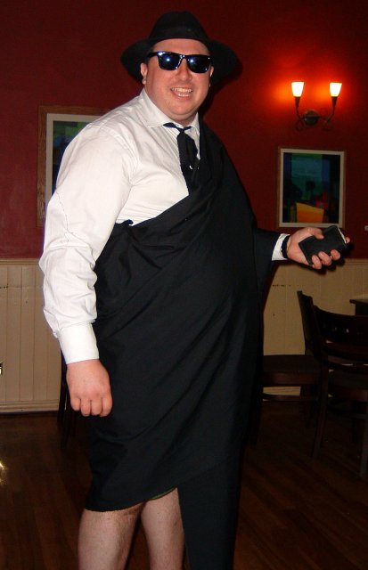 Panda modelling the latest addition to the Blues Brothers toga collection.