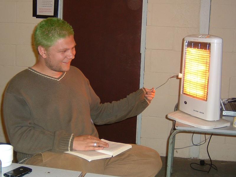 Chas roasting marshmallows by the halogen fire.