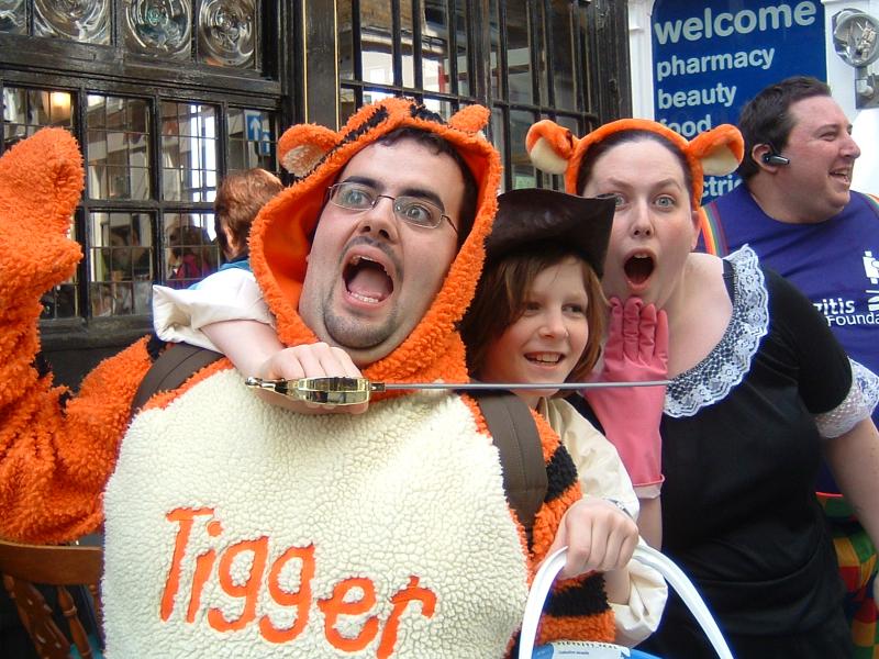 Husey, wearing Tigger's costume, being held by Toad with Rachel wearing Huseyin's French maid outfit.