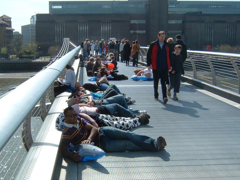 Everyone lies down for a rest halfway across the bridge.