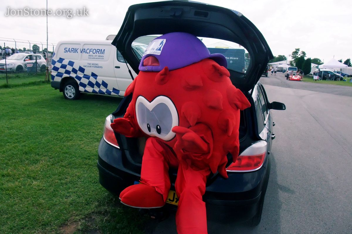 The Meningitis Research Foundation's mascot, Marvin, hitches a left around the paddock.