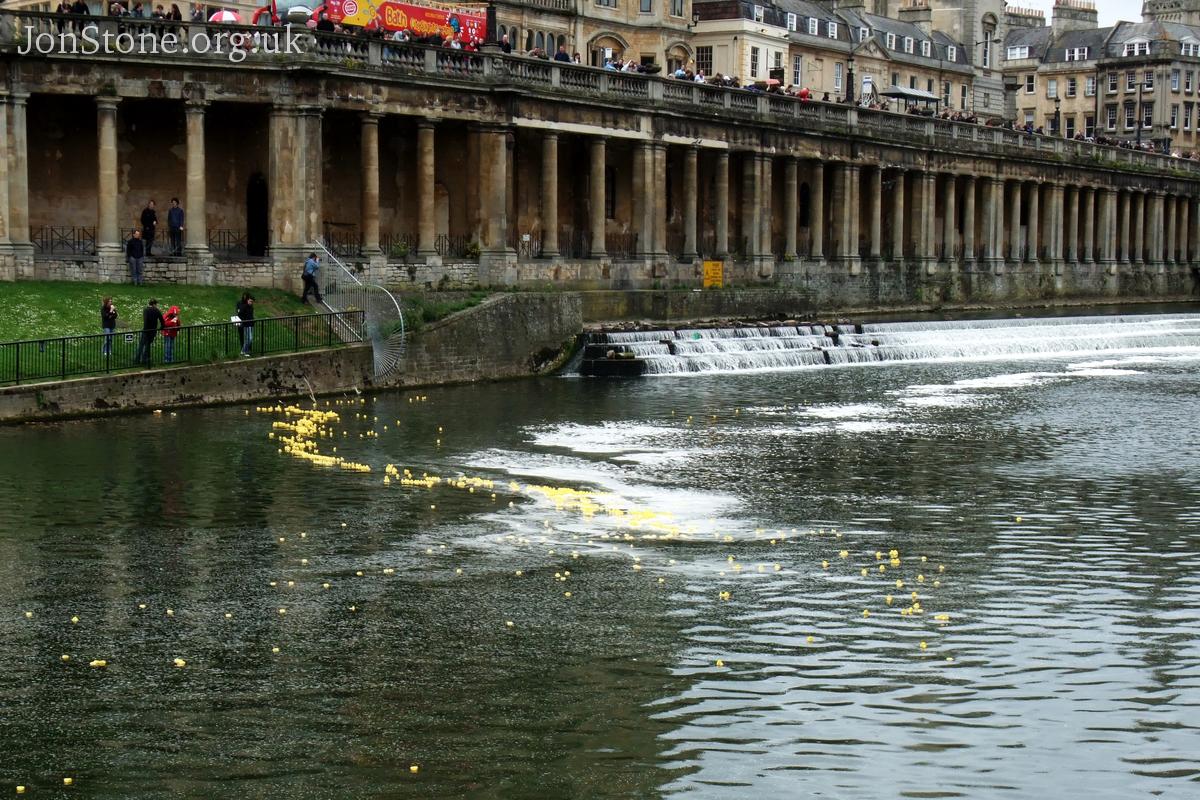 The field of ducks has successfully negotiated the weir and race towards the finish line.